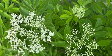 Elderberry grows well in full sun to partial shade and is a fast-growing shrub that reaches 12-15 feet. Pruning can control its height and degree of shrubbiness. It flowers around June in my garden with bounteous, fragrant, and useful flower clusters. It spreads through rhizomes and is very hardy and easy to grow. It can be a stand-alone plant or make a great privacy hedge or windbreak. I use it to make elderflower cordial and elderberry syrup and jelly. Elderberries are a rich source of vitamins C and B6, iron and antioxidants and are commonly used to fight colds and flu. Make sure you cook them! Raw berries will make you sick and don’t taste good. The plant grows best in moist, well-drained soils but is thriving in my heavy clay soil. Bare root plants are available once foliage has died back and plant is dormant in the fall and spring for $22 for a gallon sized plant or $38 for a larger shrub.